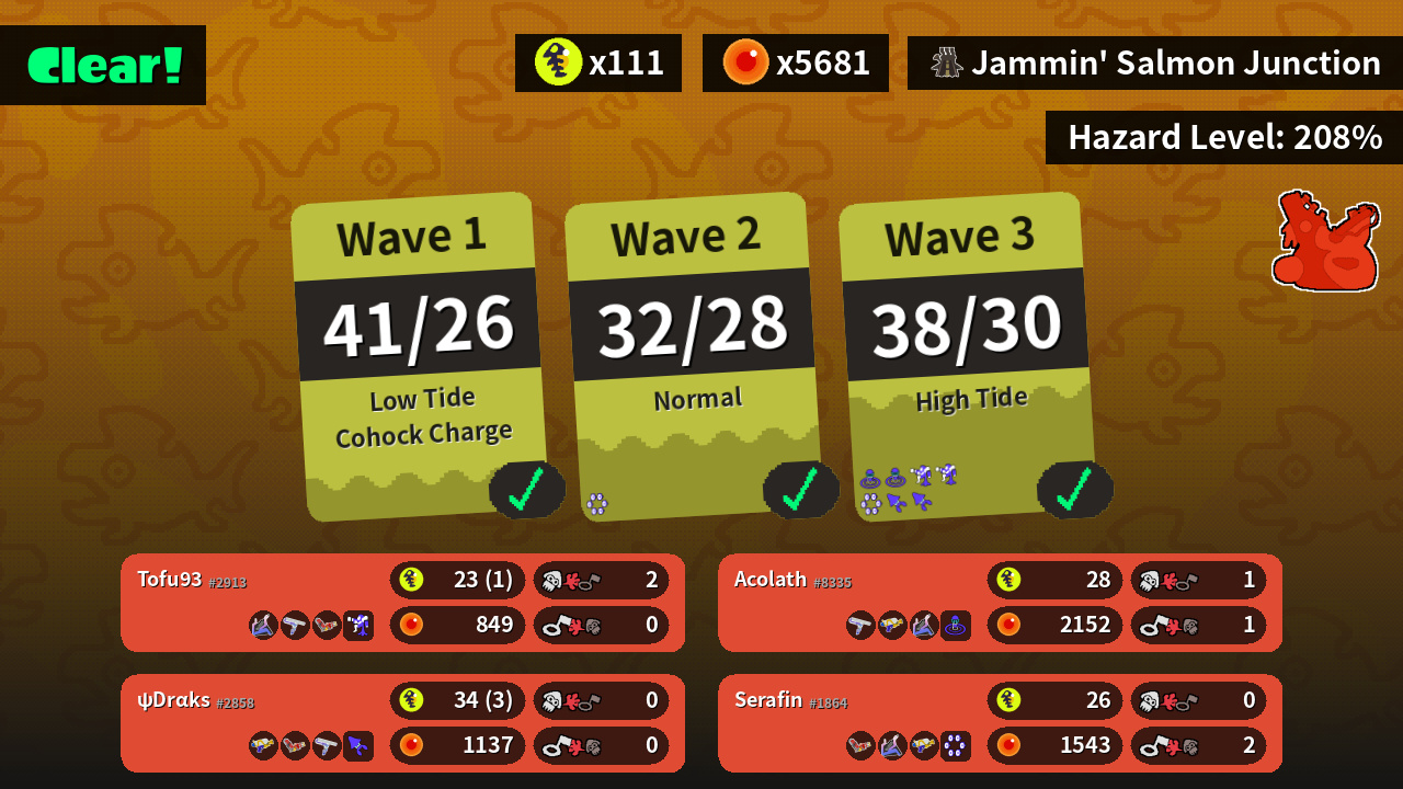 | Weapons | Slosher Big Swig Roller Hydra Splatling | Splattershot Hydra Splatling Big Swig Roller | Big Swig Roller Splattershot Slosher | Hydra Splatling Slosher Splattershot |