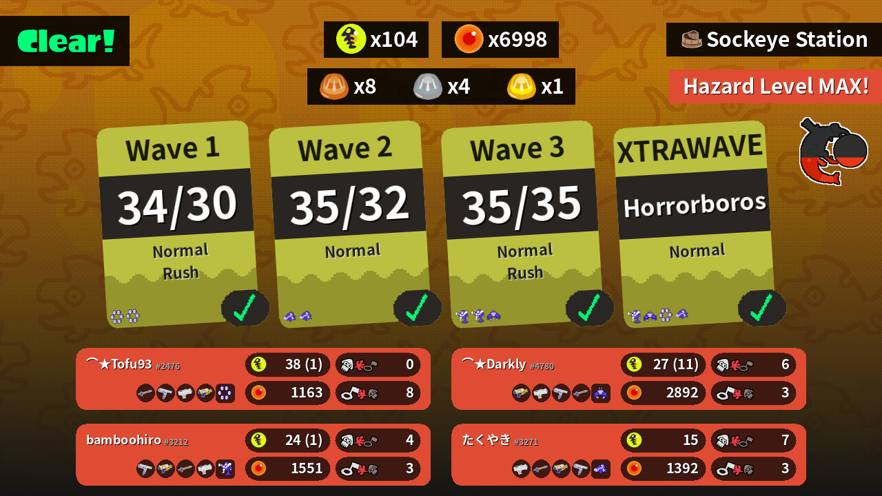 | Weapons | Snipewriter 5H Big Swig Roller Splattershot Jr. Splattershot | Splattershot Splattershot Jr. Big Swig Roller Snipewriter 5H | Big Swig Roller Splattershot Snipewriter 5H Splattershot Jr. | Splattershot Jr. Snipewriter 5H Splattershot Big Swig Roller |