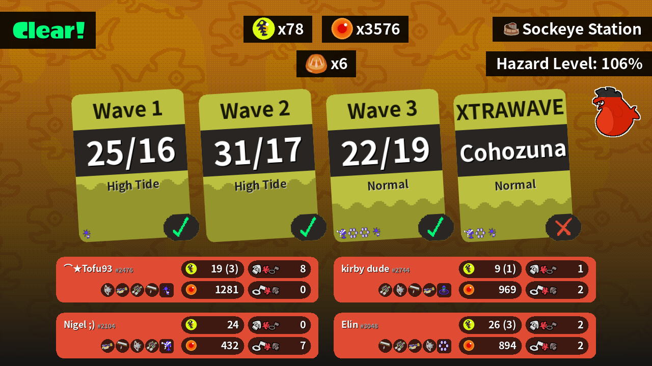 | Weapons | Tri-Stringer Mini Splatling Splat Dualies Carbon Roller | Carbon Roller Splat Dualies Mini Splatling Tri-Stringer | Mini Splatling Carbon Roller Tri-Stringer Splat Dualies | Splat Dualies Tri-Stringer Carbon Roller Mini Splatling |