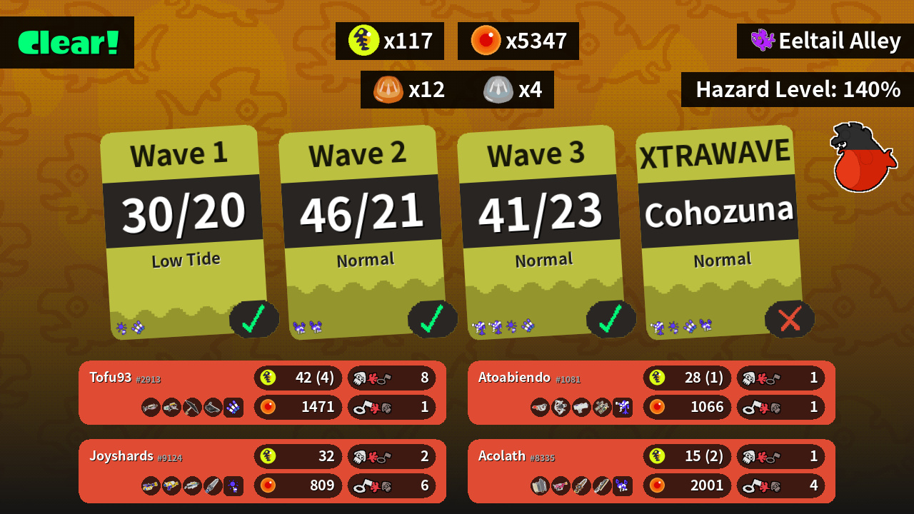 | Weapons | Grizzco Charger Grizzco Blaster Undercover Brella Bloblobber | Mini Splatling Splattershot Grizzco Brella Splatana Stamper | Goo Tuber REEF-LUX 450 Splattershot Jr. Grizzco Dualies | Sloshing Machine Rapid Blaster Pro Grizzco Splatana Splatana Wiper |