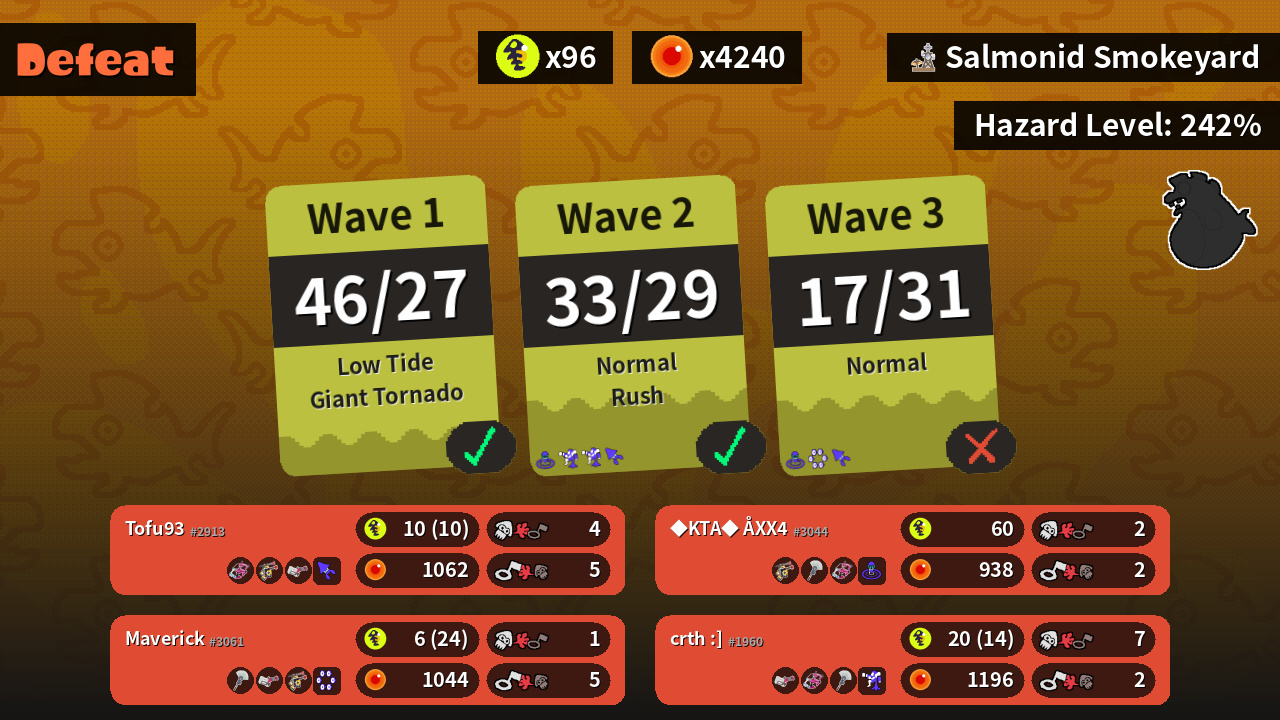 | Weapons | Dapple Dualies Douser Dualies FF Heavy Splatling | Douser Dualies FF Painbrush Dapple Dualies | Heavy Splatling Dapple Dualies Painbrush | Painbrush Heavy Splatling Douser Dualies FF |