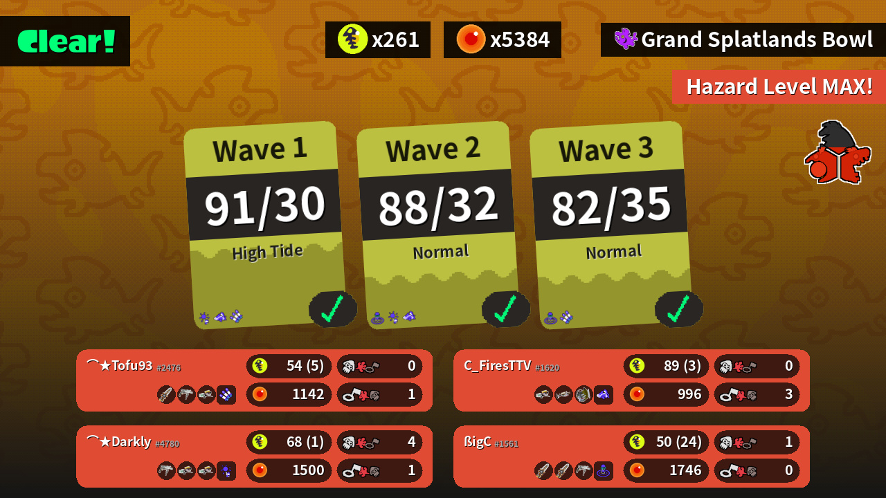 | Weapons | Grizzco Splatana Grizzco Roller Grizzco Blaster | Grizzco Blaster Grizzco Charger Grizzco Slosher | Grizzco Roller Grizzco Blaster Grizzco Blaster | Grizzco Splatana Grizzco Splatana Grizzco Roller |