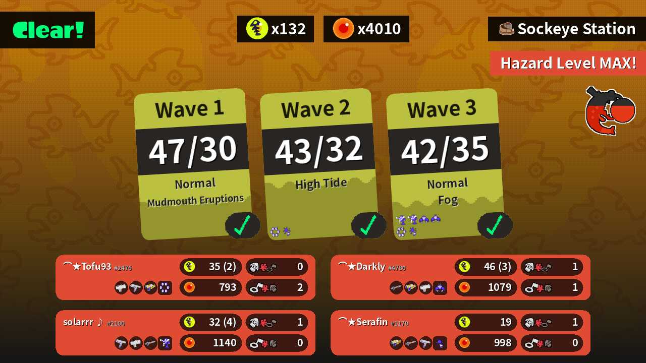 | Weapons | Splattershot Jr. Big Swig Roller Splattershot | Snipewriter 5H Splattershot Splattershot Jr. | Big Swig Roller Splattershot Jr. Snipewriter 5H | Splattershot Snipewriter 5H Big Swig Roller |