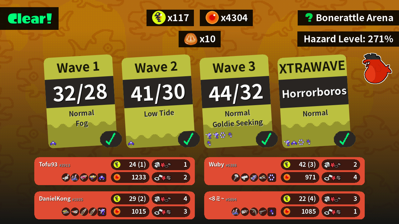 | Weapons | Luna Blaster Slosher Rapid Blaster Splattershot | Painbrush Splattershot Jr. Glooga Dualies Grizzco Blaster | Dread Wringer Goo Tuber Grizzco Splatana Grizzco Splatana | Slosher Heavy Edit Splatling Tenta Brella N-ZAP '85 |