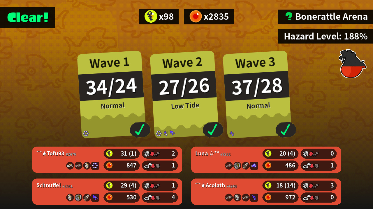 | Weapons | Grizzco Blaster Grizzco Charger Grizzco Stringer | Grizzco Stringer Grizzco Slosher Grizzco Splatana | Grizzco Charger Grizzco Slosher Grizzco Splatana | Grizzco Charger Grizzco Stringer Grizzco Charger |