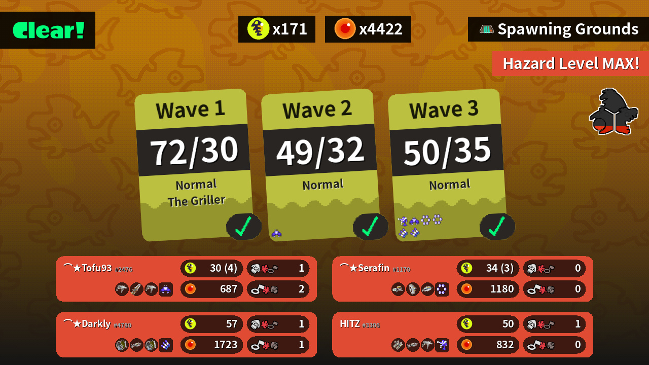| Weapons | Grizzco Roller Grizzco Splatana Grizzco Roller | Grizzco Slosher Grizzco Charger Grizzco Slosher | Grizzco Dualies Grizzco Charger Grizzco Roller | Grizzco Blaster Grizzco Stringer Grizzco Brella |