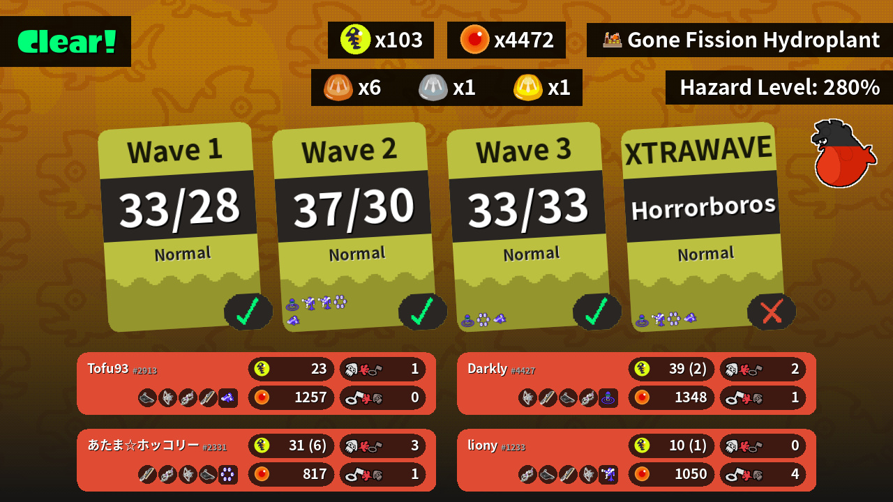 | Weapons | Bloblobber Tri-Stringer Dark Tetra Dualies Splatana Wiper | Tri-Stringer Splatana Wiper Bloblobber Dark Tetra Dualies | Splatana Wiper Dark Tetra Dualies Tri-Stringer Bloblobber | Dark Tetra Dualies Bloblobber Splatana Wiper Tri-Stringer |
