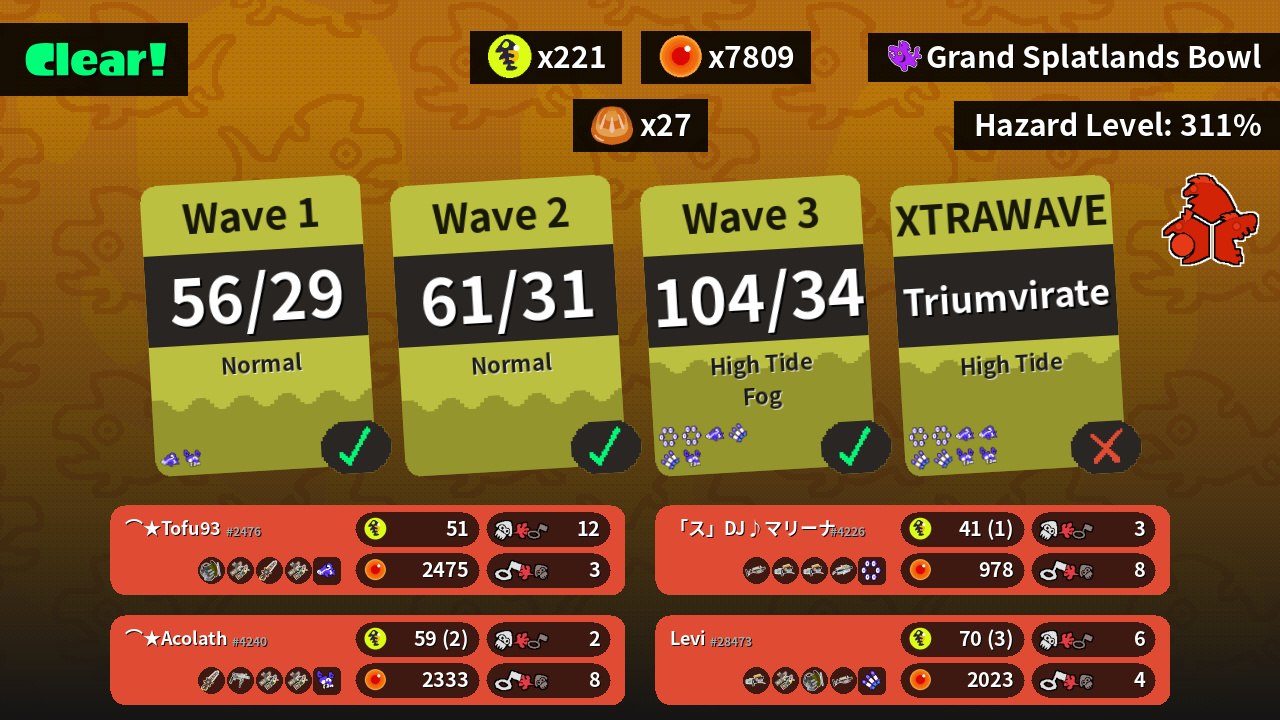 | Weapons | Grizzco Slosher Grizzco Dualies Grizzco Splatana Grizzco Dualies | Grizzco Blaster Grizzco Dualies Grizzco Slosher Grizzco Charger | Grizzco Splatana Grizzco Roller Grizzco Dualies Grizzco Dualies | Grizzco Charger Grizzco Blaster Grizzco Blaster Grizzco Brella |