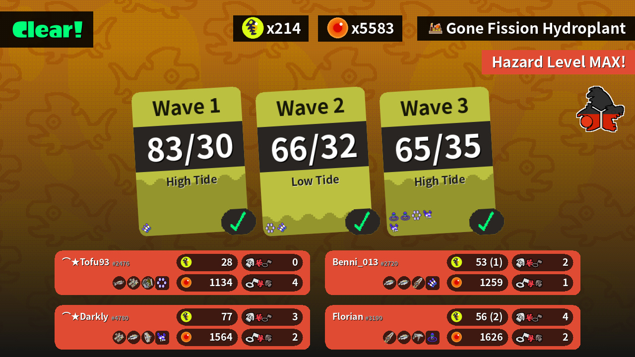 | Weapons | Grizzco Charger Grizzco Dualies Grizzco Slosher | Grizzco Dualies Grizzco Brella Grizzco Stringer | Grizzco Splatana Grizzco Brella Grizzco Roller | Grizzco Brella Grizzco Brella Grizzco Splatana |