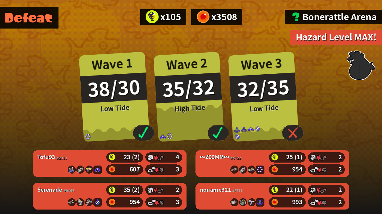 | Weapons | Slosher Dark Tetra Dualies Splattershot | Grizzco Blaster Grizzco Stringer Aerospray MG | Grizzco Charger Dark Tetra Dualies Grizzco Blaster | Heavy Edit Splatling Grizzco Slosher Big Swig Roller |