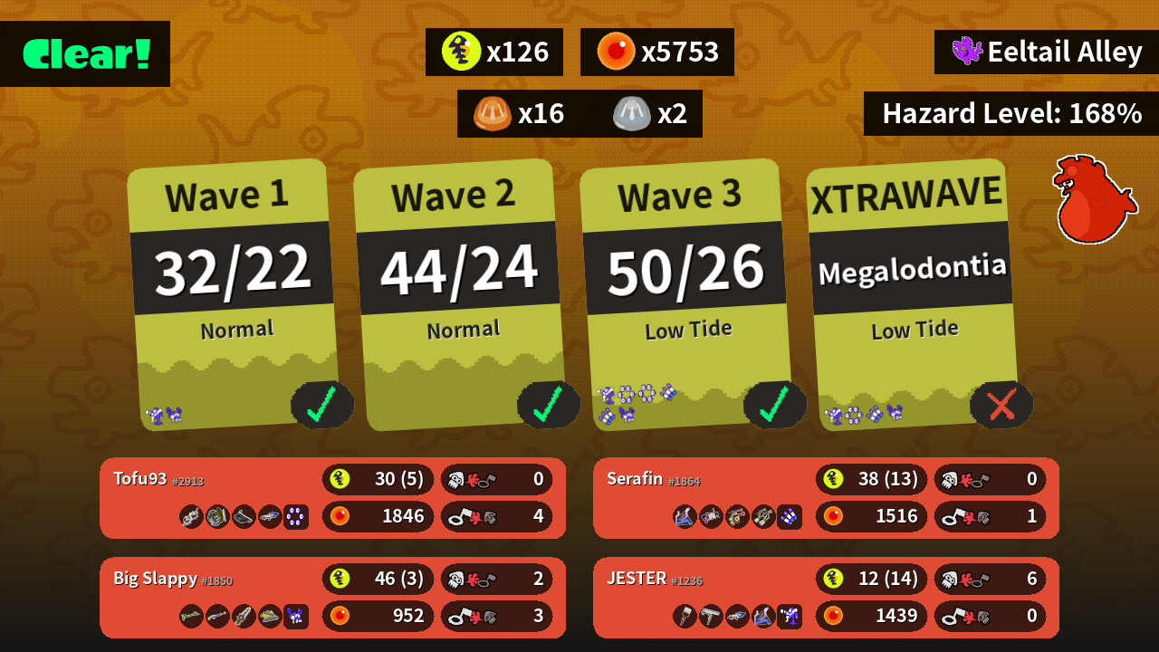 | Weapons | Dark Tetra Dualies Grizzco Slosher Bloblobber Splattershot Pro | Bamboozler 14 Mk I Splat Charger Grizzco Splatana Dread Wringer | Slosher .52 Gal Douser Dualies FF Splat Dualies | Octobrush Dynamo Roller Splattershot Pro Slosher |