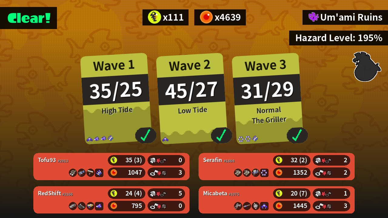 | Weapons | Splat Dualies L-3 Nozzlenose Carbon Roller | Grizzco Dualies Grizzco Dualies Clash Blaster | S-BLAST '92 Bloblobber Splattershot | Aerospray MG Splat Charger Tri-Stringer |