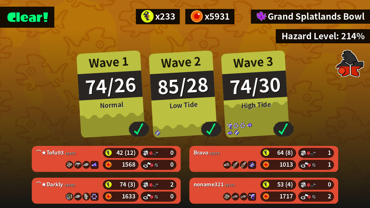 | Weapons | Grizzco Dualies Grizzco Roller Grizzco Brella | Grizzco Slosher Grizzco Brella Grizzco Stringer | Grizzco Blaster Grizzco Splatana Grizzco Splatana | Grizzco Dualies Grizzco Charger Grizzco Charger |