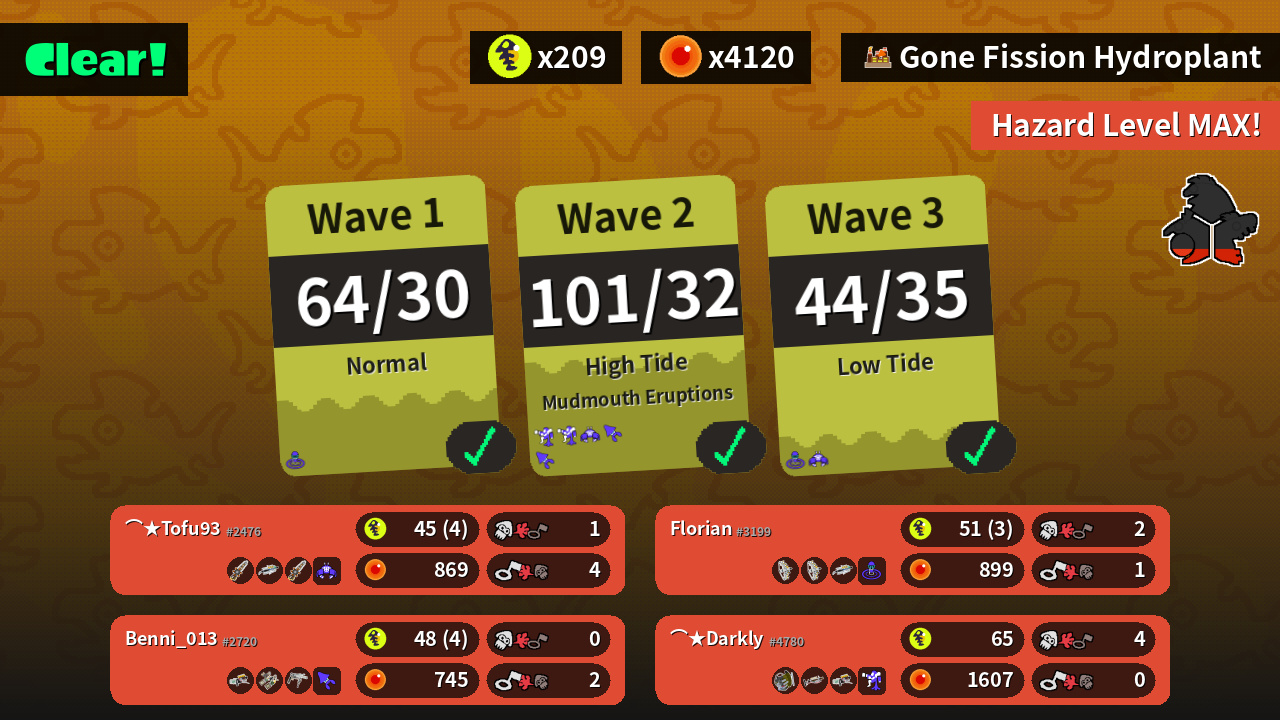 | Weapons | Grizzco Splatana Grizzco Brella Grizzco Splatana | Grizzco Slosher Grizzco Charger Grizzco Blaster | Grizzco Stringer Grizzco Stringer Grizzco Brella | Grizzco Blaster Grizzco Dualies Grizzco Roller |