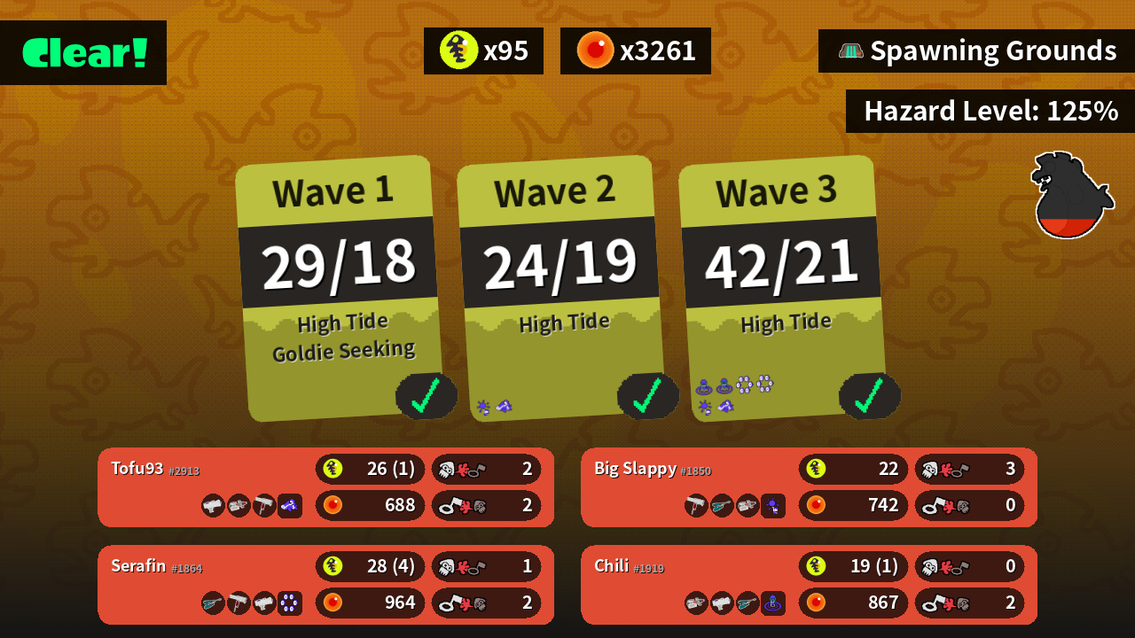 | Weapons | Splattershot Jr. Heavy Edit Splatling Flingza Roller | Jet Squelcher Flingza Roller Splattershot Jr. | Flingza Roller Jet Squelcher Heavy Edit Splatling | Heavy Edit Splatling Splattershot Jr. Jet Squelcher |