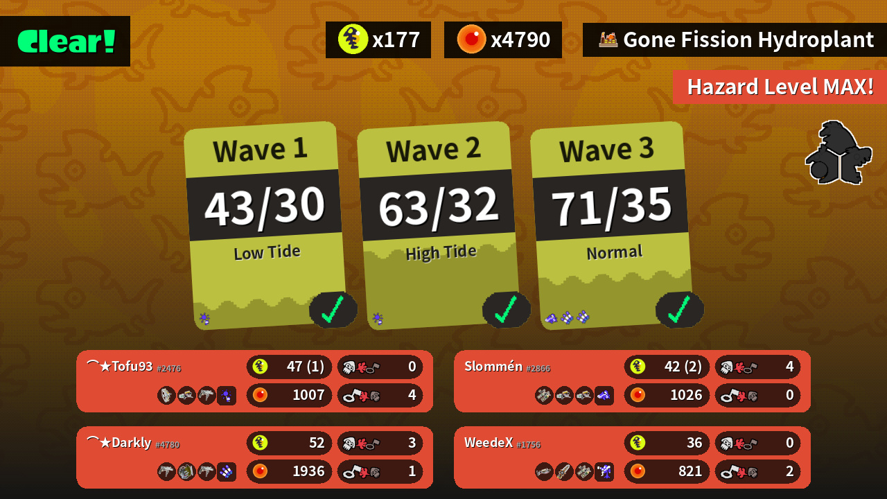 | Weapons | Grizzco Stringer Grizzco Blaster Grizzco Roller | Grizzco Roller Grizzco Slosher Grizzco Roller | Grizzco Dualies Grizzco Blaster Grizzco Blaster | Grizzco Charger Grizzco Splatana Grizzco Dualies |