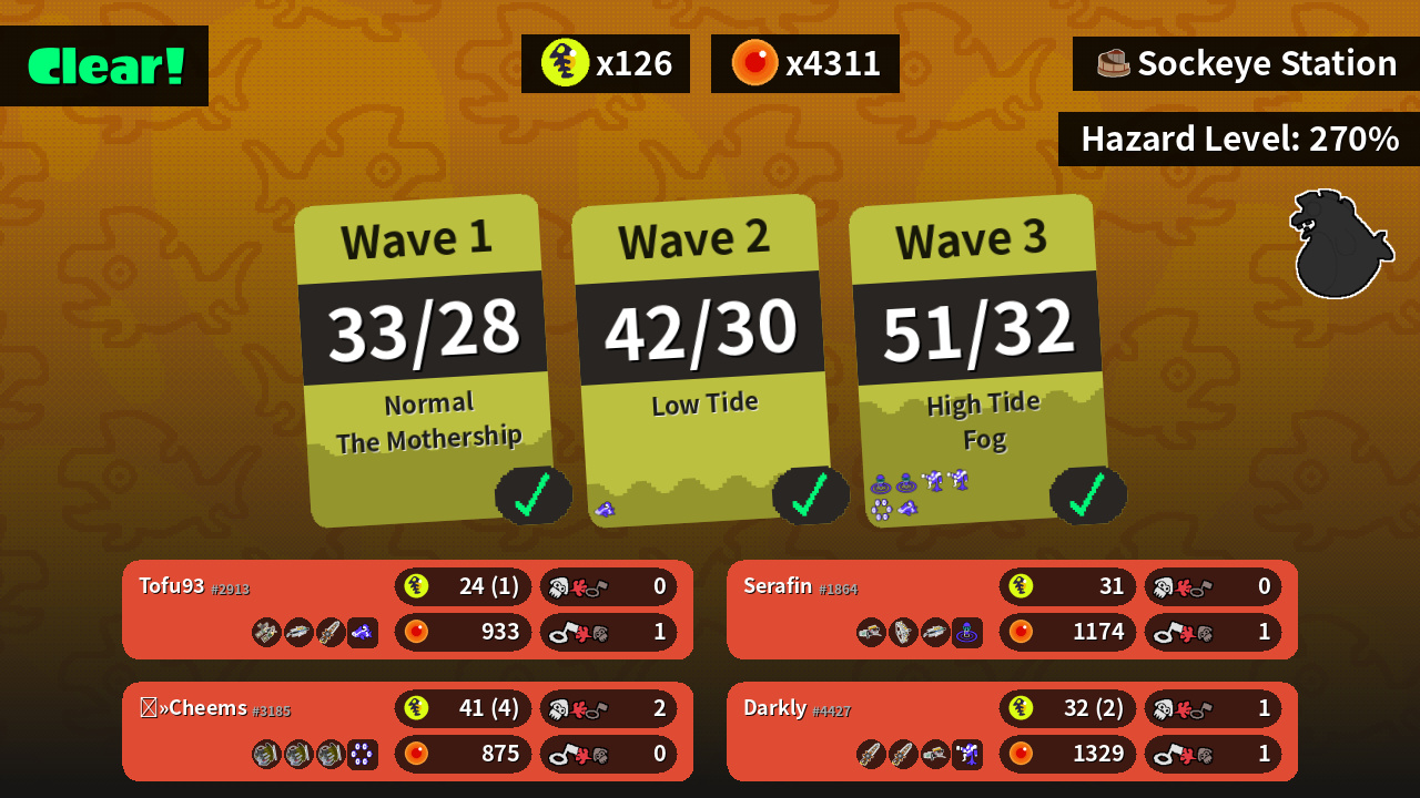 | Weapons | Grizzco Dualies Grizzco Brella Grizzco Splatana | Grizzco Slosher Grizzco Slosher Grizzco Slosher | Grizzco Splatana Grizzco Splatana Grizzco Blaster | Grizzco Blaster Grizzco Stringer Grizzco Brella |