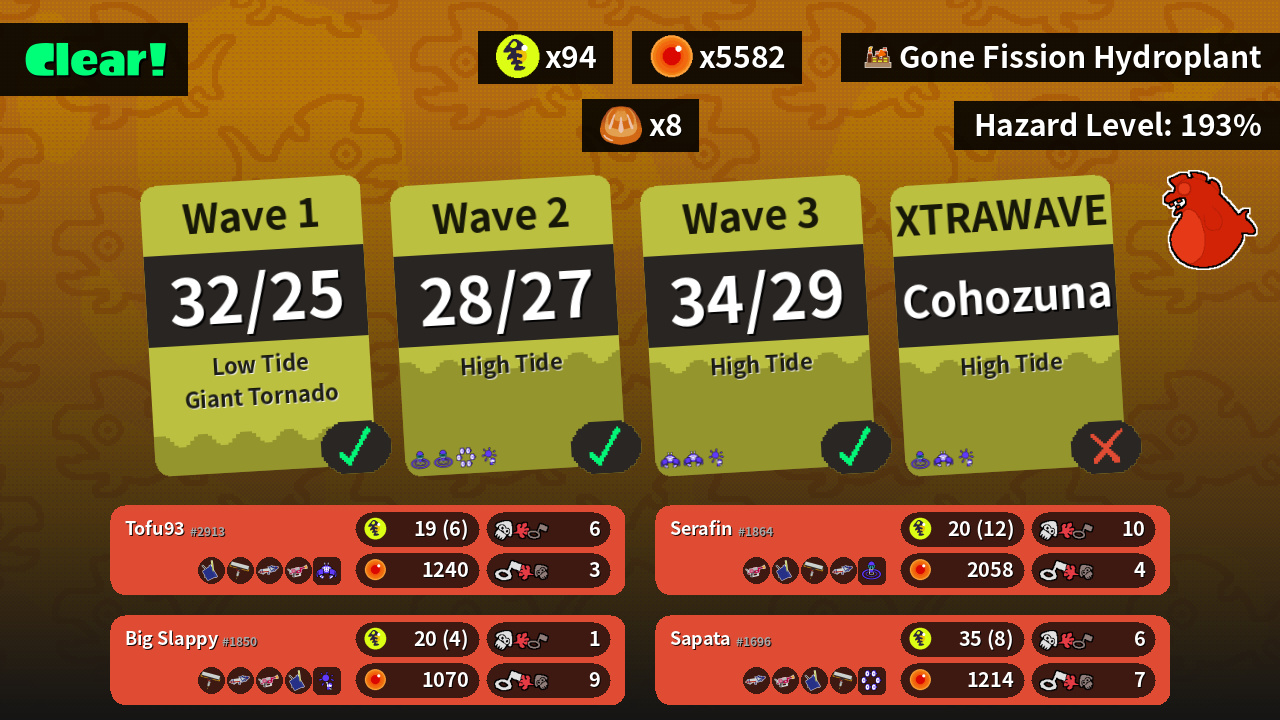 | Weapons | Tri-Slosher Carbon Roller Splattershot Pro Rapid Blaster Pro | Splattershot Pro Rapid Blaster Pro Tri-Slosher Carbon Roller | Rapid Blaster Pro Tri-Slosher Carbon Roller Splattershot Pro | Carbon Roller Splattershot Pro Rapid Blaster Pro Tri-Slosher |