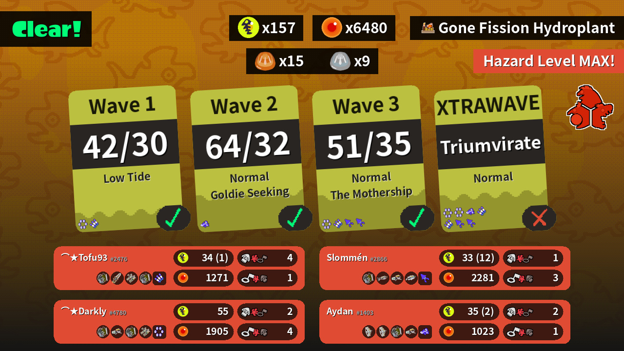 | Weapons | Grizzco Slosher Grizzco Splatana Grizzco Dualies Grizzco Slosher | Grizzco Slosher Grizzco Blaster Grizzco Slosher Grizzco Dualies | Grizzco Stringer Grizzco Stringer Grizzco Slosher Grizzco Blaster | Grizzco Slosher Grizzco Charger Grizzco Blaster Grizzco Brella |