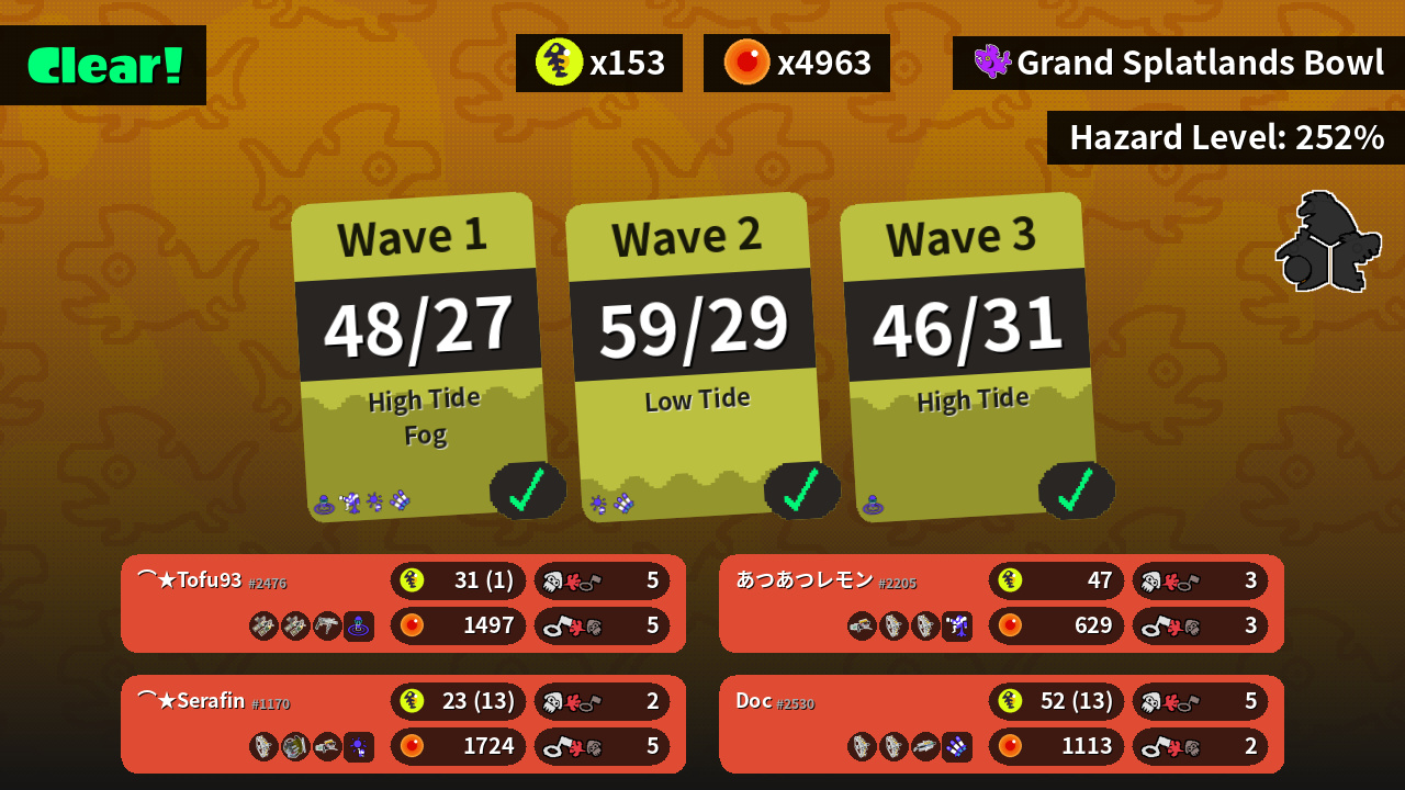 | Weapons | Grizzco Dualies Grizzco Dualies Grizzco Roller | Grizzco Stringer Grizzco Stringer Grizzco Brella | Grizzco Blaster Grizzco Stringer Grizzco Stringer | Grizzco Stringer Grizzco Slosher Grizzco Blaster |