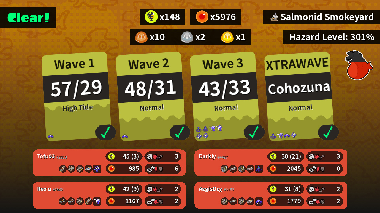 | Boss Salmonid | 13 | 15 | 44 | 31 |