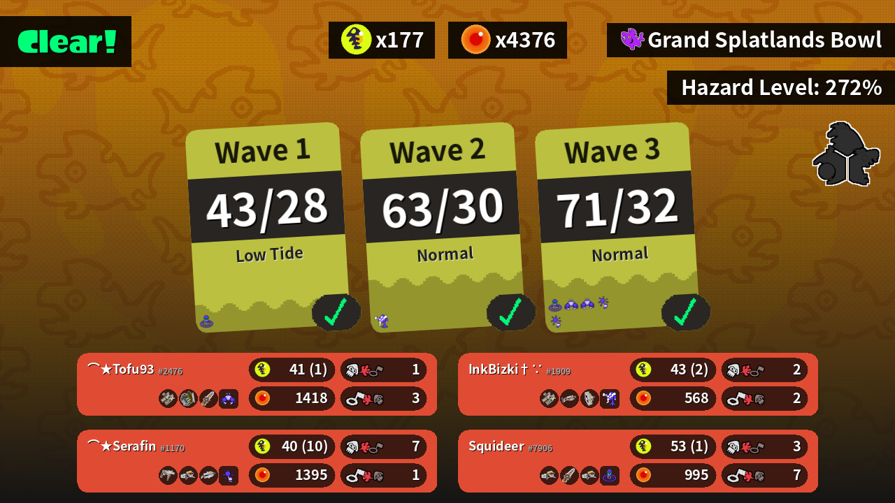 | Weapons | Grizzco Dualies Grizzco Slosher Grizzco Splatana | Grizzco Blaster Grizzco Splatana Grizzco Blaster | Grizzco Dualies Grizzco Charger Grizzco Stringer | Grizzco Roller Grizzco Blaster Grizzco Brella |