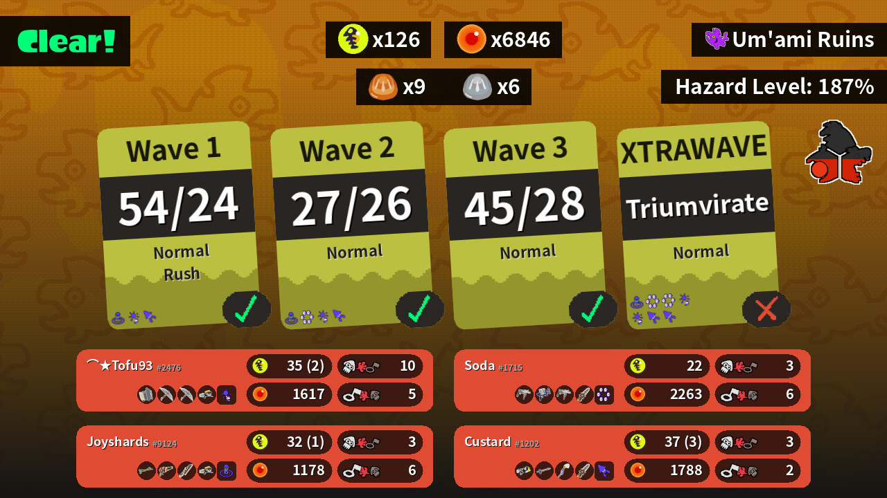 | Weapons | Sloshing Machine Splat Brella Splat Brella Grizzco Blaster | Splattershot Nova Snipewriter 5H Inkbrush Grizzco Splatana | Bamboozler 14 Mk I Squeezer Splatana Wiper Grizzco Blaster | Grizzco Roller Clash Blaster Grizzco Roller Grizzco Splatana |