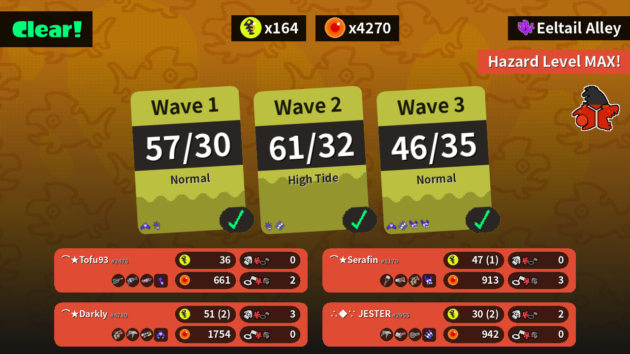 | Weapons | Jet Squelcher H-3 Nozzlenose Splattershot Pro | Douser Dualies FF Grizzco Roller Splattershot Nova | Octobrush Blaster Douser Dualies FF | Grizzco Roller Heavy Splatling Nautilus 47 |
