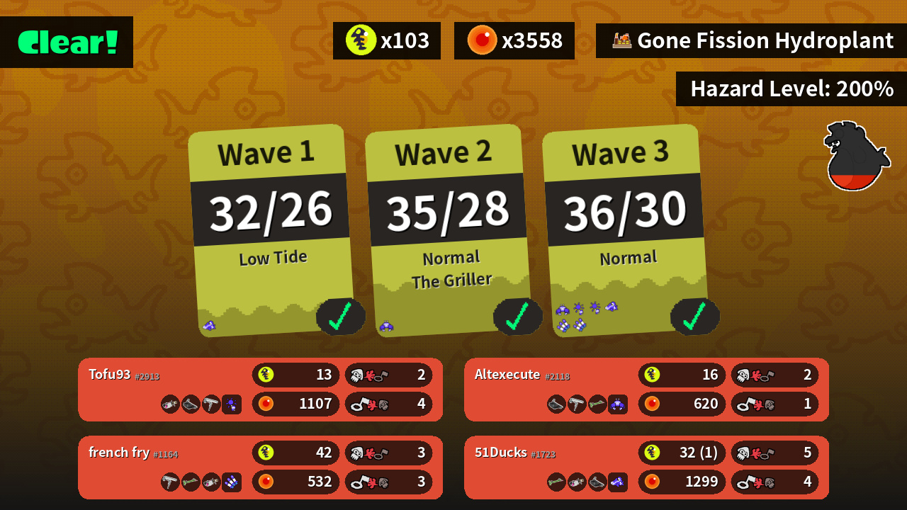 | Weapons | .96 Gal Bloblobber Dynamo Roller | Dynamo Roller Bamboozler 14 Mk I .96 Gal | Bamboozler 14 Mk I .96 Gal Bloblobber | Bloblobber Dynamo Roller Bamboozler 14 Mk I |
