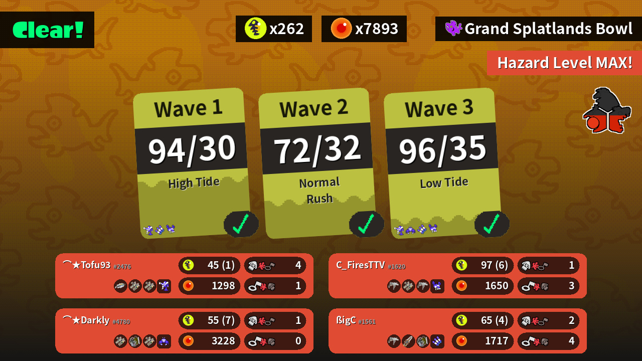 | Weapons | Grizzco Brella Grizzco Dualies Grizzco Dualies | Grizzco Roller Grizzco Dualies Grizzco Roller | Grizzco Roller Grizzco Splatana Grizzco Slosher | Grizzco Dualies Grizzco Slosher Grizzco Dualies |
