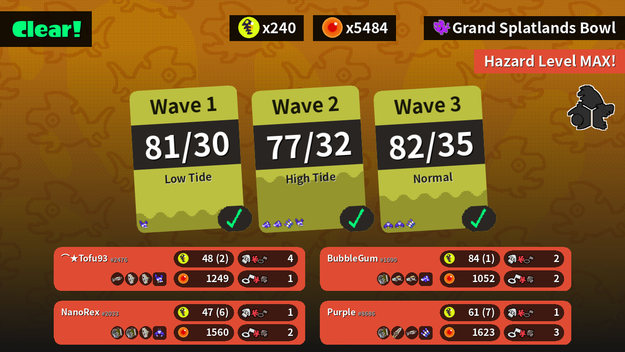 | Weapons | Grizzco Charger Grizzco Stringer Grizzco Stringer | Grizzco Slosher Grizzco Blaster Grizzco Blaster | Grizzco Slosher Grizzco Splatana Grizzco Charger | Grizzco Slosher Grizzco Slosher Grizzco Stringer |