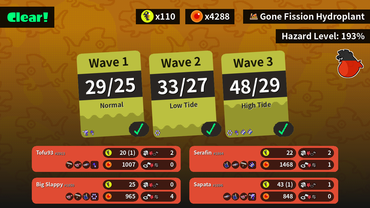 | Weapons | Carbon Roller Rapid Blaster Pro Splattershot Pro | Splattershot Pro Tri-Slosher Rapid Blaster Pro | Rapid Blaster Pro Carbon Roller Tri-Slosher | Tri-Slosher Splattershot Pro Carbon Roller |
