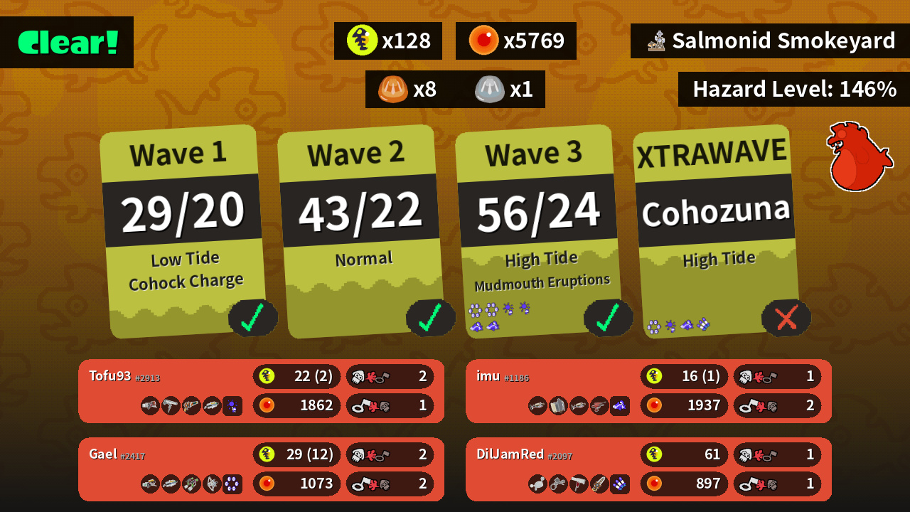 | Weapons | Blaster Dynamo Roller Squeezer Grizzco Brella | Luna Blaster Aerospray MG Flingza Roller Grizzco Splatana | Grizzco Blaster Grizzco Brella Splat Dualies Tri-Stringer | Grizzco Charger Sloshing Machine Grizzco Charger Dualie Squelchers |