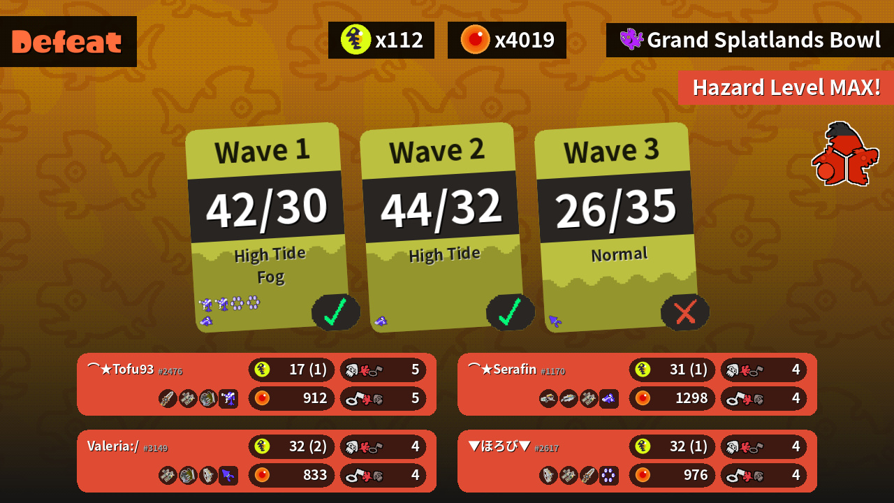 | Weapons | Grizzco Splatana Grizzco Dualies Grizzco Slosher | Grizzco Stringer Grizzco Dualies Grizzco Splatana | Grizzco Dualies Grizzco Slosher Grizzco Stringer | Grizzco Blaster Grizzco Brella Grizzco Dualies |