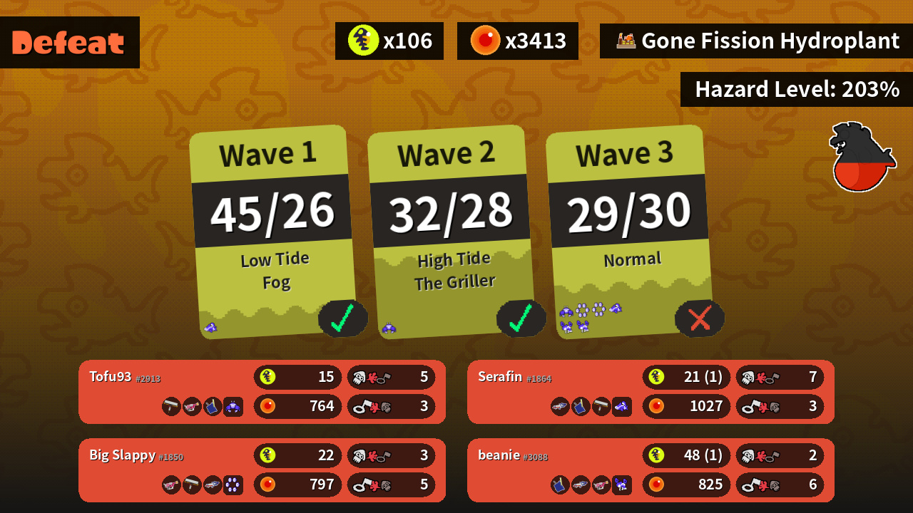 | Weapons | Carbon Roller Rapid Blaster Pro Tri-Slosher | Tri-Slosher Splattershot Pro Rapid Blaster Pro | Rapid Blaster Pro Carbon Roller Splattershot Pro | Splattershot Pro Tri-Slosher Carbon Roller |