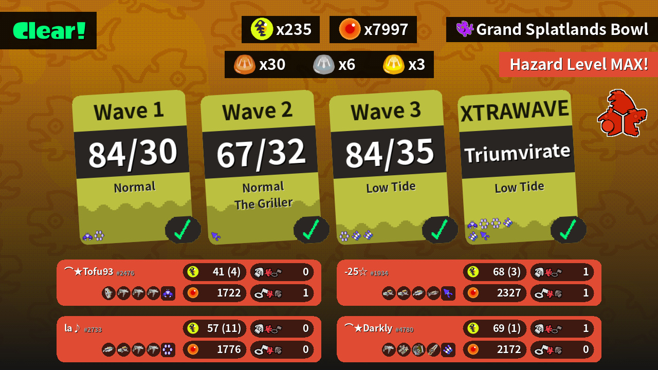 | Weapons | Grizzco Stringer Grizzco Roller Grizzco Roller Grizzco Roller | Grizzco Roller Grizzco Dualies Grizzco Slosher Grizzco Splatana | Grizzco Blaster Grizzco Blaster Grizzco Brella Grizzco Charger | Grizzco Brella Grizzco Blaster Grizzco Roller Grizzco Roller |