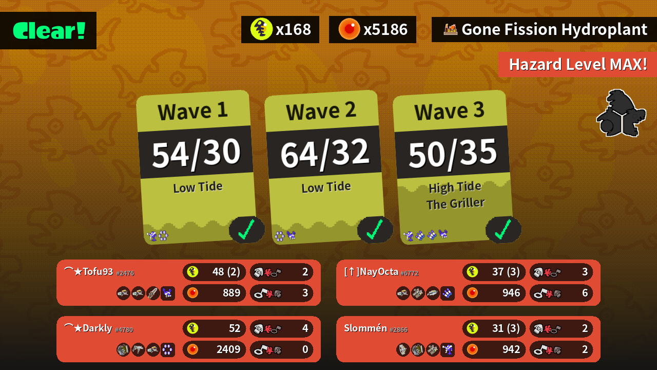 | Weapons | Grizzco Blaster Grizzco Blaster Grizzco Splatana | Grizzco Slosher Grizzco Roller Grizzco Blaster | Grizzco Blaster Grizzco Dualies Grizzco Brella | Grizzco Stringer Grizzco Slosher Grizzco Dualies |