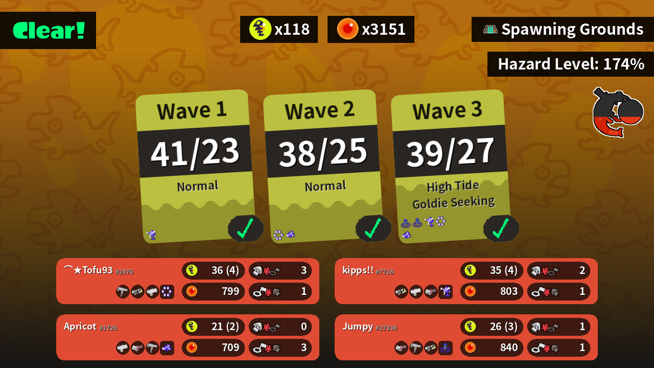 | Weapons | Dynamo Roller Splattershot Nova Splattershot Jr. | Splattershot Nova Splattershot Jr. Heavy Splatling | Heavy Splatling Dynamo Roller Splattershot Nova | Splattershot Jr. Heavy Splatling Dynamo Roller |