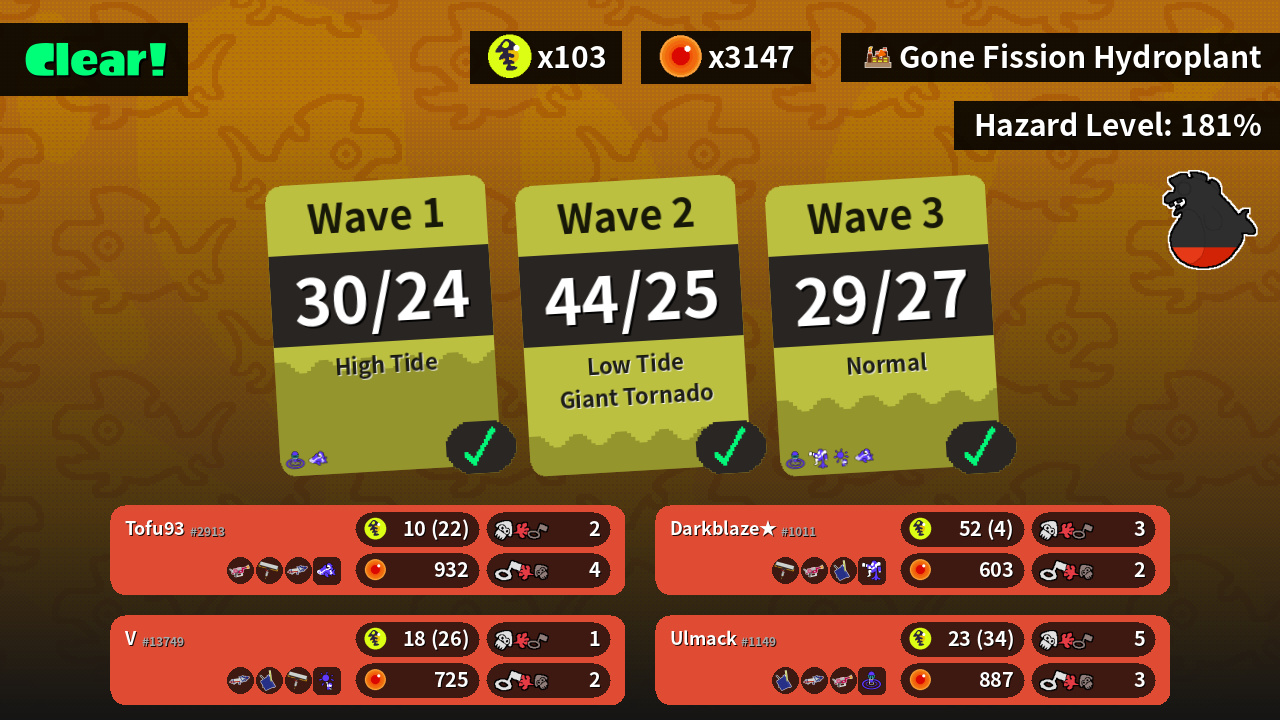 | Weapons | Rapid Blaster Pro Carbon Roller Splattershot Pro | Carbon Roller Rapid Blaster Pro Tri-Slosher | Tri-Slosher Splattershot Pro Rapid Blaster Pro | Splattershot Pro Tri-Slosher Carbon Roller |