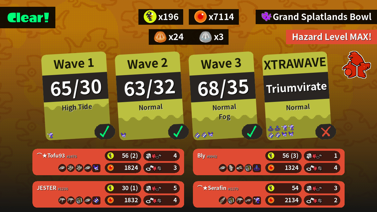 | Weapons | Grizzco Brella Grizzco Dualies Grizzco Dualies Grizzco Brella | Grizzco Brella Grizzco Stringer Grizzco Blaster Grizzco Slosher | Grizzco Splatana Grizzco Slosher Grizzco Roller Grizzco Charger | Grizzco Roller Grizzco Roller Grizzco Slosher Grizzco Brella |