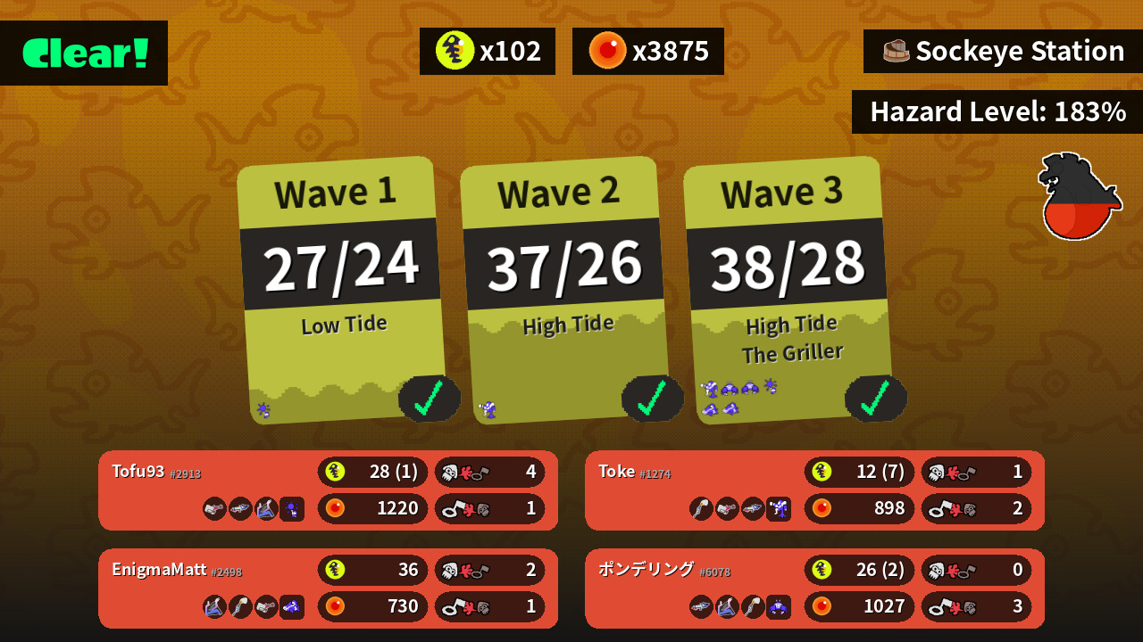 | Weapons | Heavy Splatling Splattershot Pro Slosher | Slosher Inkbrush Heavy Splatling | Splattershot Pro Slosher Inkbrush | Inkbrush Heavy Splatling Splattershot Pro |
