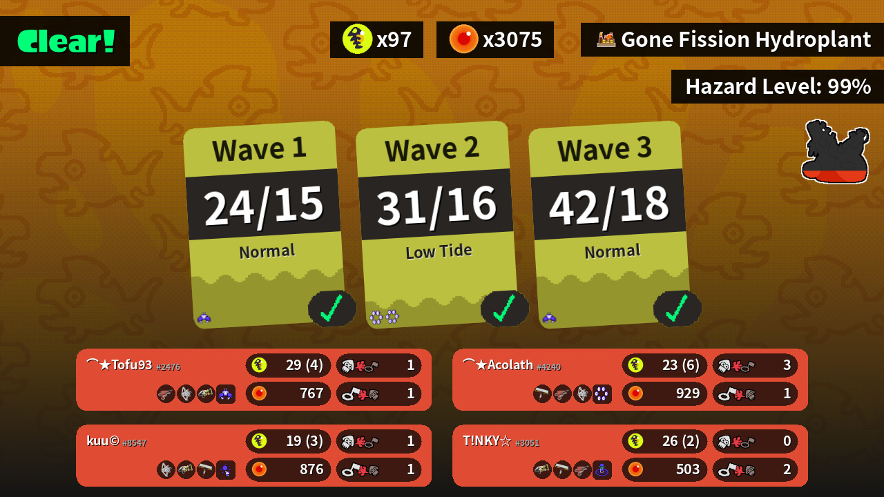| Weapons | Dualie Squelchers Tri-Stringer Sploosh-o-matic | Sploosh-o-matic Carbon Roller Dualie Squelchers | Carbon Roller Dualie Squelchers Tri-Stringer | Tri-Stringer Sploosh-o-matic Carbon Roller |