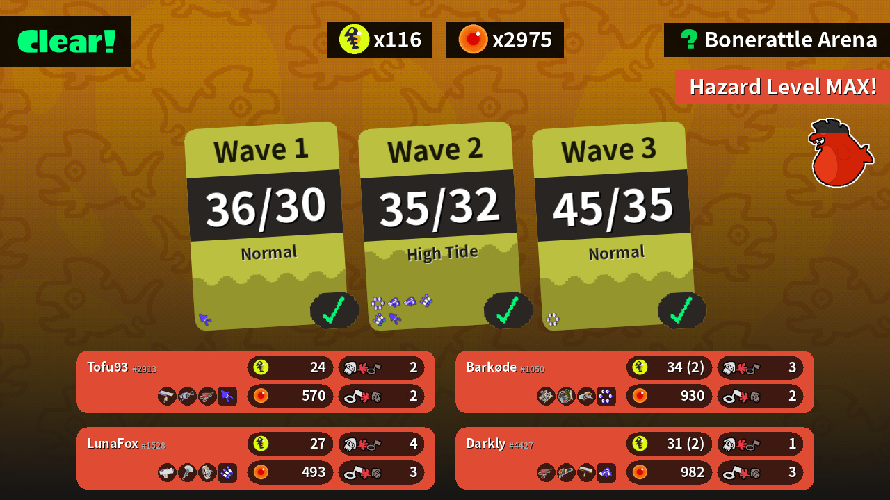 | Weapons | Splat Roller H-3 Nozzlenose Dualie Squelchers | Grizzco Dualies Grizzco Slosher Grizzco Blaster | Dualie Squelchers Squeezer Carbon Roller | Splattershot Jr. Painbrush Grizzco Stringer |
