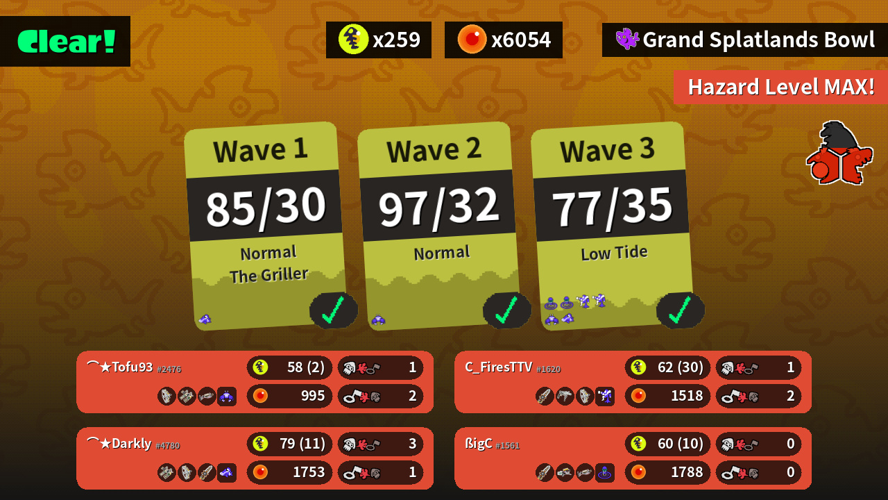 | Weapons | Grizzco Stringer Grizzco Dualies Grizzco Charger | Grizzco Dualies Grizzco Stringer Grizzco Splatana | Grizzco Splatana Grizzco Roller Grizzco Stringer | Grizzco Splatana Grizzco Blaster Grizzco Charger |