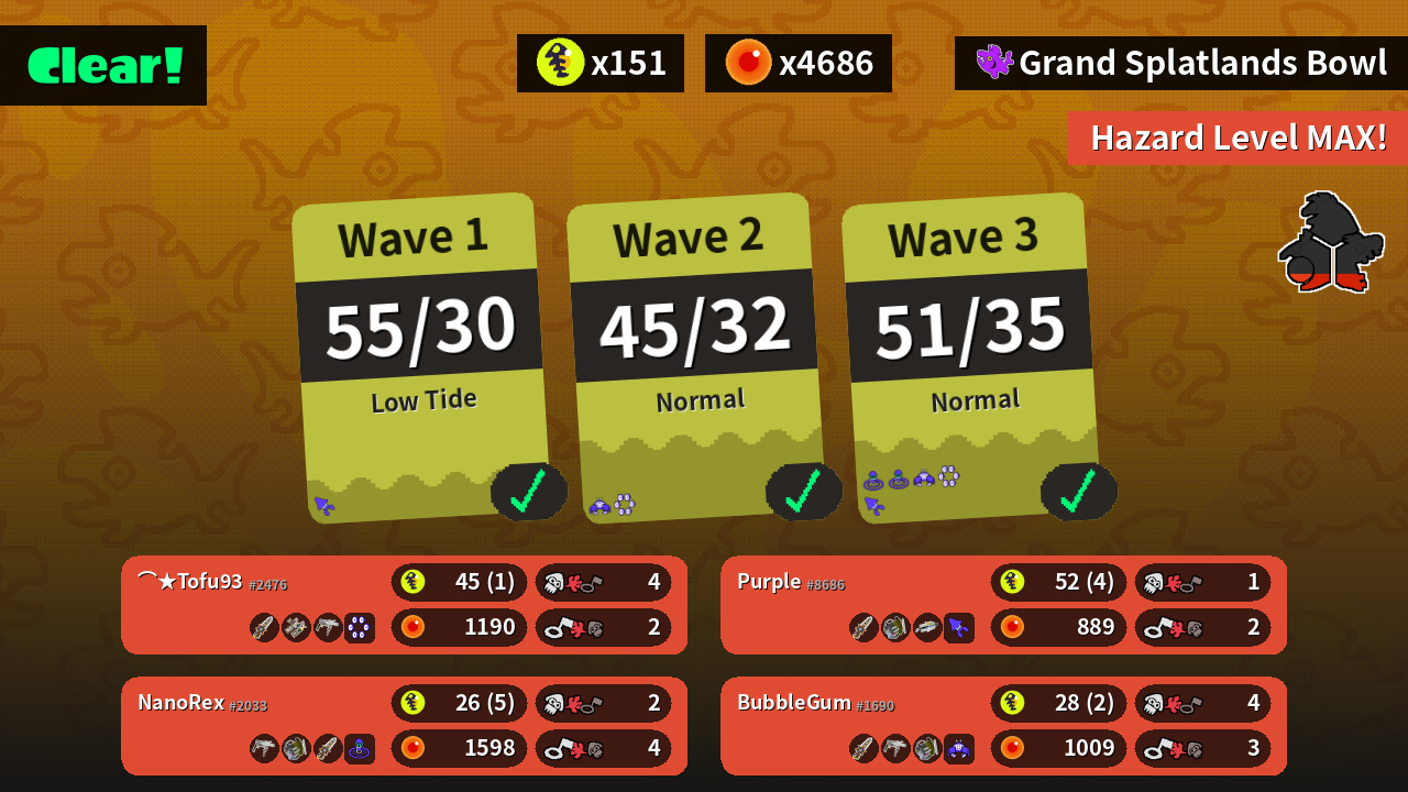 | Weapons | Grizzco Splatana Grizzco Dualies Grizzco Roller | Grizzco Splatana Grizzco Slosher Grizzco Brella | Grizzco Splatana Grizzco Roller Grizzco Slosher | Grizzco Roller Grizzco Slosher Grizzco Splatana |