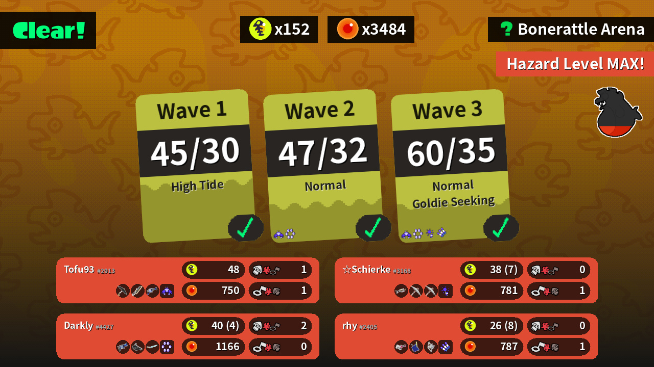 | Weapons | Undercover Brella Splatana Wiper H-3 Nozzlenose | L-3 Nozzlenose Bloblobber Classic Squiffer | Grizzco Charger Recycled Brella 24 Mk I Recycled Brella 24 Mk I | Heavy Splatling Tri-Slosher Tri-Stringer |