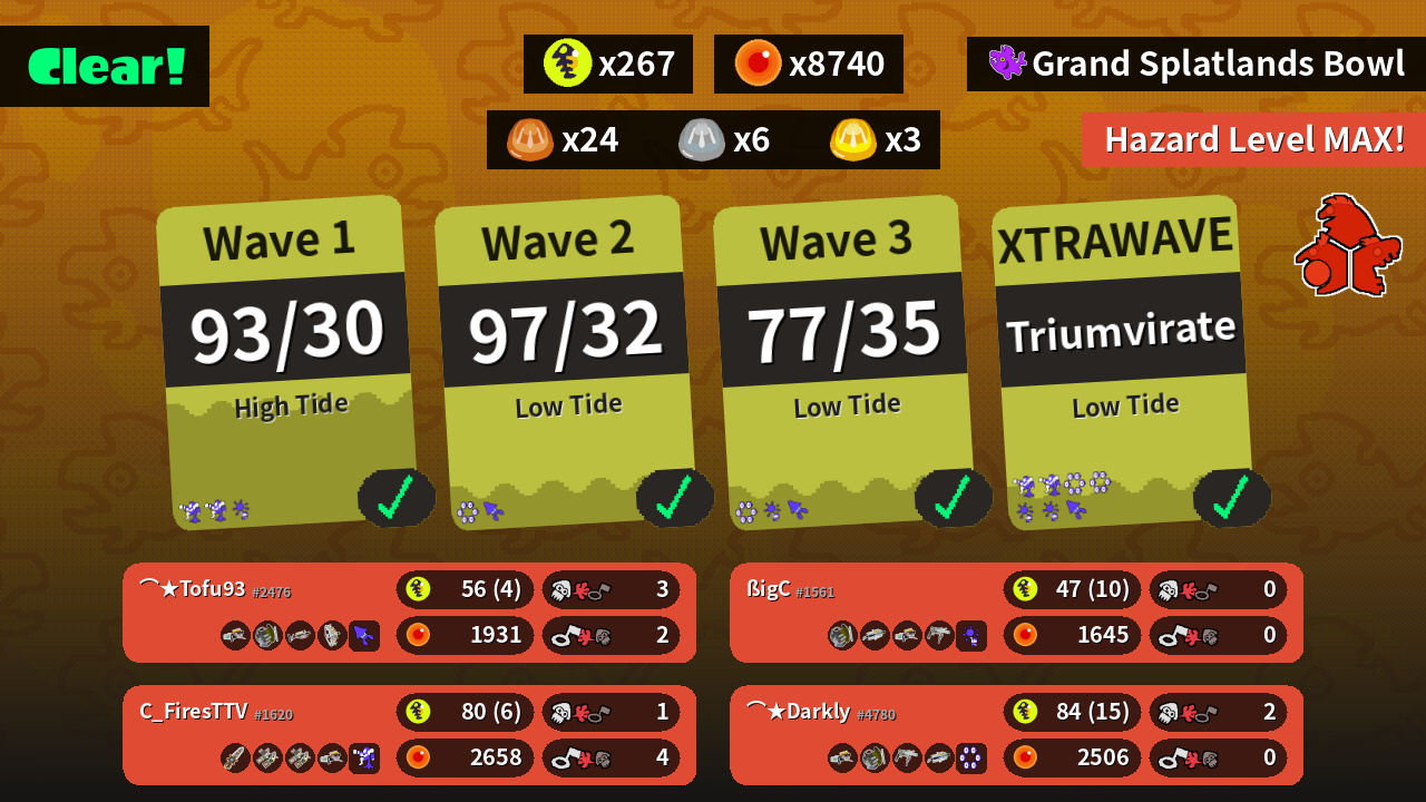 | Weapons | Grizzco Blaster Grizzco Slosher Grizzco Charger Grizzco Stringer | Grizzco Blaster Grizzco Slosher Grizzco Roller Grizzco Brella | Grizzco Splatana Grizzco Dualies Grizzco Dualies Grizzco Blaster | Grizzco Slosher Grizzco Brella Grizzco Blaster Grizzco Roller |