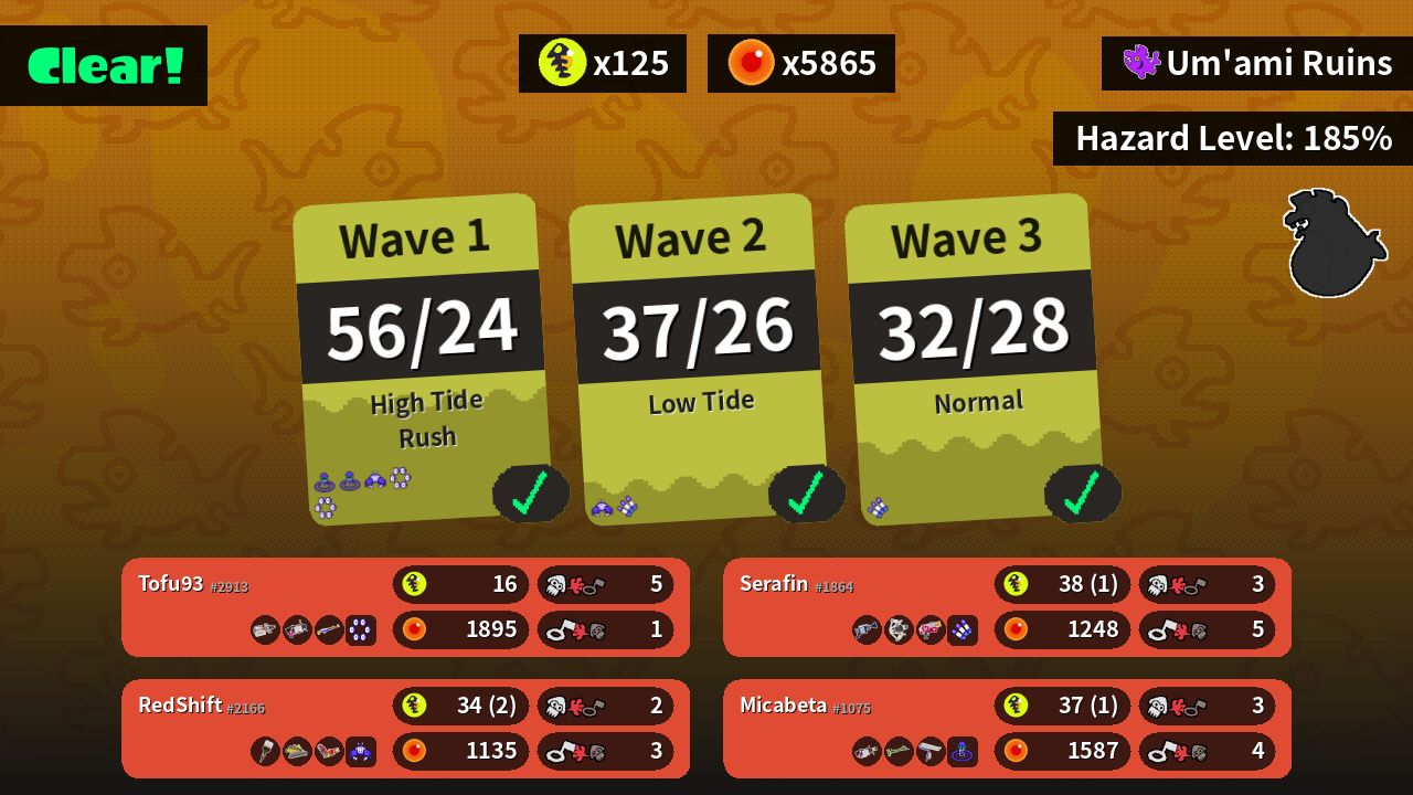 | Weapons | Heavy Edit Splatling .52 Gal Splat Charger | H-3 Nozzlenose REEF-LUX 450 Rapid Blaster | .96 Gal Bamboozler 14 Mk I Splat Roller | Octobrush Dread Wringer Hydra Splatling |