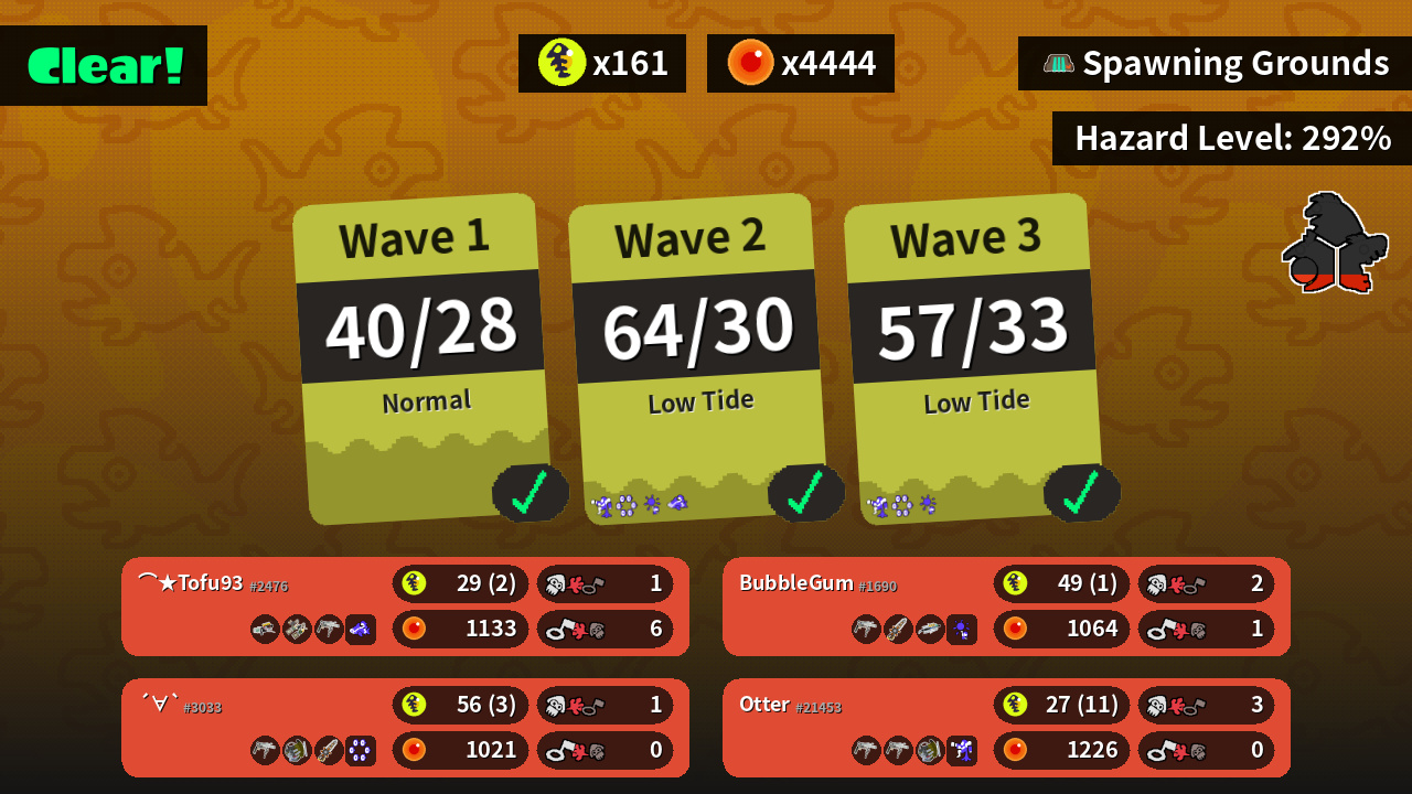 | Weapons | Grizzco Blaster Grizzco Dualies Grizzco Roller | Grizzco Roller Grizzco Slosher Grizzco Splatana | Grizzco Roller Grizzco Splatana Grizzco Brella | Grizzco Roller Grizzco Roller Grizzco Slosher |