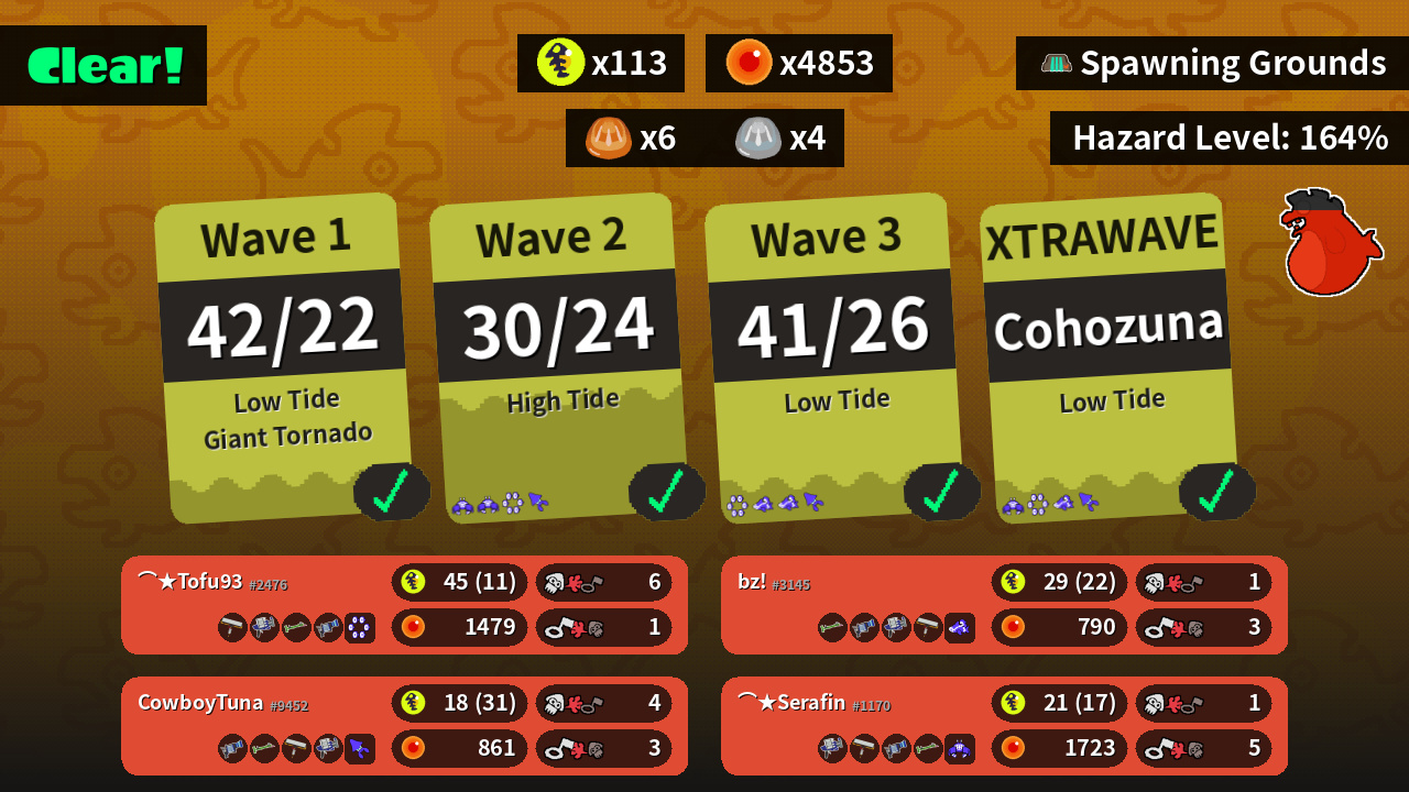 | Weapons | Carbon Roller Clash Blaster Bamboozler 14 Mk I L-3 Nozzlenose | Bamboozler 14 Mk I L-3 Nozzlenose Clash Blaster Carbon Roller | Clash Blaster Carbon Roller L-3 Nozzlenose Bamboozler 14 Mk I | L-3 Nozzlenose Bamboozler 14 Mk I Carbon Roller Clash Blaster |